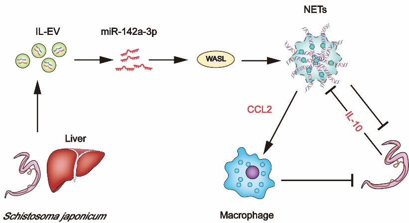 该研究采用小鼠模型,从宿主细胞外囊泡的角度,发现日本血吸虫感染后,小鼠肝组织来源的胞外囊泡可以通过传递重要宿主源性miRNA(miR-142a-3p)特异性靶向WASL(编码Wiskott-Aldrich综合征蛋白的基因)诱导中性粒细胞外捕获网(NETs)形成,从而抑制血吸虫的生长发育。同时,NETs可以上调趋化因子CCL2募集巨噬细胞杀伤血吸虫。特别值得关注的是,血吸虫可以通过上调IL-10来抑制NETs形成,从而达到免疫逃逸的目的。该研究从宿主细胞外囊泡角度全新阐述了宿主-血吸虫相互博弈的分子机制,也为血吸虫病和相关感染性疾病的防治提供了新的思路。