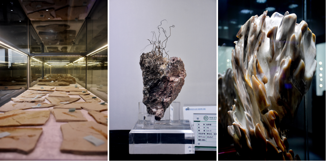 左上:标准大化石陈列馆;右上:矿物岩石标本和古生物化石陈列馆
