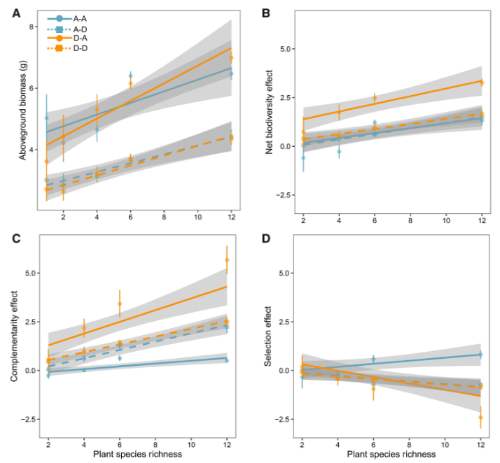 研究发现(图2-3):(i)干旱降低了细菌和真菌的丰富度,并改变了植物物种丰富度和微生物群之间的关系;(ii)干旱土壤遗留效应增加了生物多样性净效应,但生物多样性净效应对植物物种丰富度的响应不受影响;(iii)植物物种丰富度和互补性/选择效应之间的联系因过去和随后的干旱而不同。本研究结果为在不断变化的环境中生物多样性与生产力的关系提供了机制上的见解,并对气候变化下生态系统功能的稳定性产生了影响。