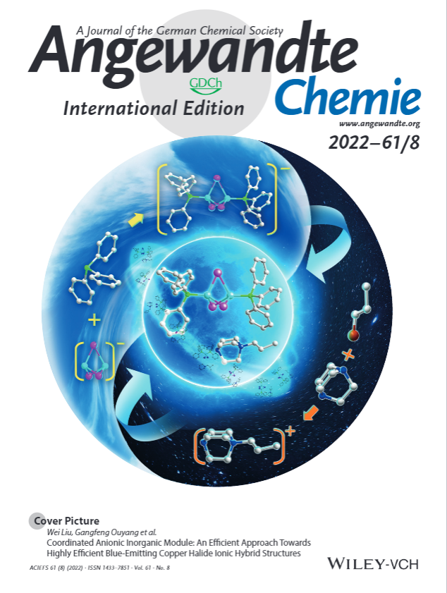 开云下注(中国)官网网讯(通讯员刘威)近日,开云下注(中国)官网化学工程与技术学院欧阳钢锋教授、刘威副教授课题组在Angewandte Chemie International Edition发表题为“Coordinated Anionic Inorganic Module—An Efficient Approach Towards Highly Efficient Blue-Emitting Copper Halide Ionic Hybrid Structures”的研究论文,并被评为热点论文(Hot Paper)和封面论文(Front Cover)。该工作提出了配位型离子团簇结构的策略,设计并得到离子键和共价键协同作用产生强蓝光发射的系列化合物,为理解卤化亚铜类杂化发光材料中结构与性能之间关系提供新思路,也为高效蓝光发光材料的设计制备提供新途径。