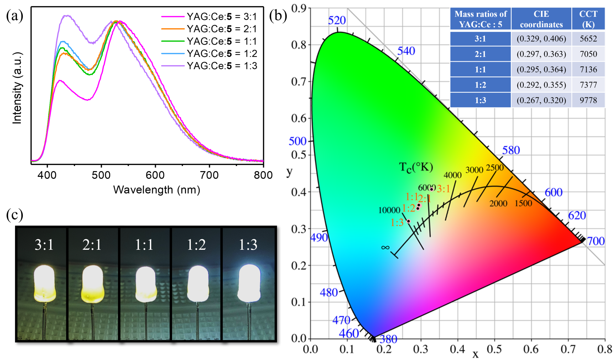 图3不同混合比例的白光发光粉末的:(a) 荧光发射谱图;(b) 色坐标图以及色温值;(c) 白光灯珠通电发光照片