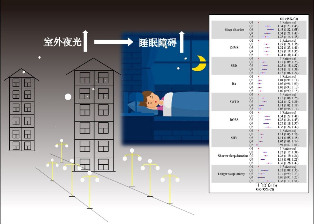 该研究发现,室外夜光与儿童青少年睡眠障碍呈显著正向关联(见图2)。与居住在室外夜光最低分位(quintile 1,即夜光水平最低)的儿童青少年相比,居住在较高分位(即夜光水平较高)的儿童青少年睡眠障碍的患病几率分别增加34%(OR=1.34, 95%CI: 1.23, 1.45)(quintile 2)、43%(OR=1.43, 95%CI: 1.32, 1.55)(quintile 3)、31%(OR=1.31, 95%CI: 1.21, 1.43)(quintile 4)和25%(OR=1.25, 95%CI: 1.14, 1.38)(quintile 5)。另外,该研究还发现年龄更小的儿童(<12岁)可能是室外夜光对儿童青少年睡眠障碍的敏感人群之一。