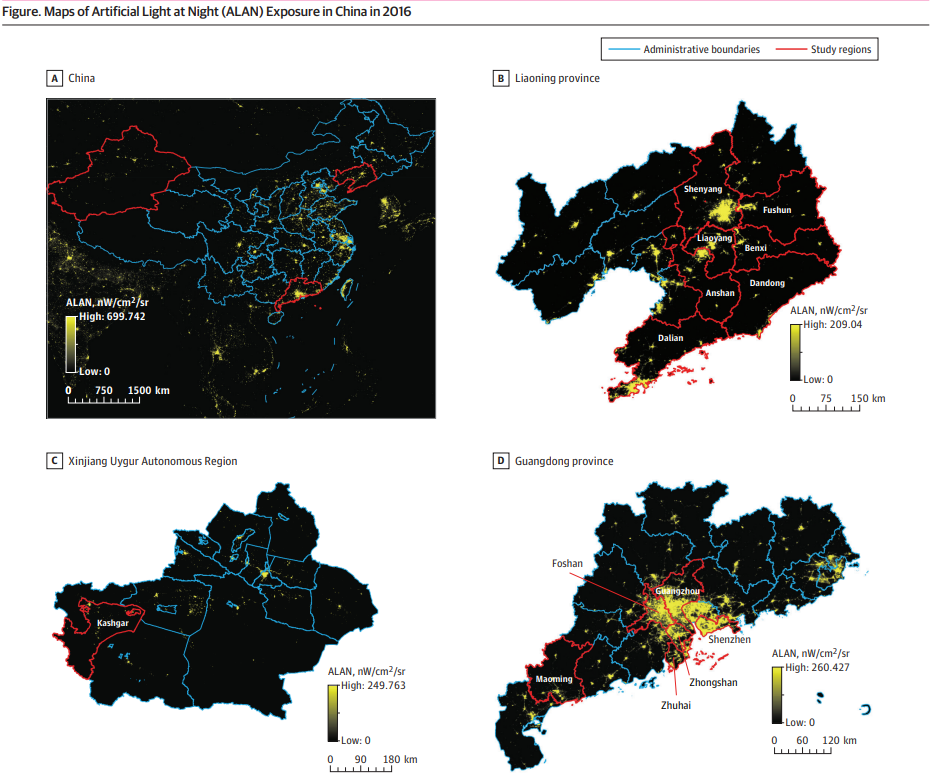 健康的睡眠对儿童身体发育和心理健康至关重要。目前的系统综述显示,我国儿童睡眠问题患病率约高达37.6%,已成为我国儿童青少年重大的公共健康问题。因此,识别导致睡眠障碍的影响环境因素,并对其进行有效干预具有非常重要的理论和现实指导意义。基于此,开云下注(中国)官网公共卫生学院董光辉教授团队在广东省、辽宁省和新疆维吾尔自治区(见图1)共选取14个城市55个行政区的201,994名儿童青少年,利用卫星图像评估了居住地址500m范围的室外夜光暴露,并进一步探讨了室外夜光和儿童青少年睡眠障碍及其亚型的关联性。