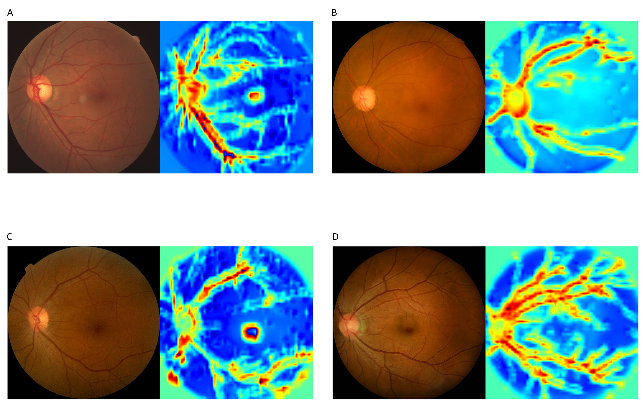 图2. 深度学习模型热图提示人工智能模型预测发病(A、B)及进展(C、D)主要关注视盘边缘和盘沿上、下血管弓区域,与临床上的关注点极为相似