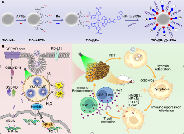 2022年8月,开云下注(中国)官网附属口腔医院吴桐副主任医师、程斌教授团队联合开云下注(中国)官网化学学院的谭彩萍教授、毛宗万教授团队在Biomaterials杂志发表了题为“Ru(II)-modified TiO2 nanoparticles for hypoxia-adaptive photo-immunotherapy of oral squamous cell carcinoma”的研究论文。为克服PDT药物乏氧限制的痛点,该研究利用钌(II)配合物(Ru)修饰二氧化钛(TiO2)纳米粒子,进一步负载缺氧诱导因子HIF-1α siRNA,制得一种新型光动力纳米颗粒TiO2@Ru@siRNA。在可见光照射下,该纳米颗粒能显著上调细胞ROS水平,诱导细胞焦亡;通过介导溶酶体损伤,促使HIF-1α siRNA逃逸,改善肿瘤局部乏氧状态。同时该纳米颗粒通过HMGB1-NF-KB-PDL1轴下调肿瘤细胞PDL1水平,促进抗肿瘤细胞因子IL-24分泌增加,激活CD4+和CD8+ T细胞,重塑局部免疫微环境。在4NQO诱导的大鼠舌癌模型和人源异种移植瘤(PDX)小鼠模型中,TiO2@Ru@siRNA遏制上皮恶性转化,增强局部免疫,抑制肿瘤生长的效果均得到进一步验证。综上,该新型纳米颗粒TiO2@Ru@siRNA能够改善肿瘤局部乏氧状态,产生较强的光动力效应,同时重塑局部免疫抑制微环境,增强肿瘤杀伤作用。基于该纳米颗粒的光免疫治疗策略为口腔鳞癌的防治提供了一种新策略。