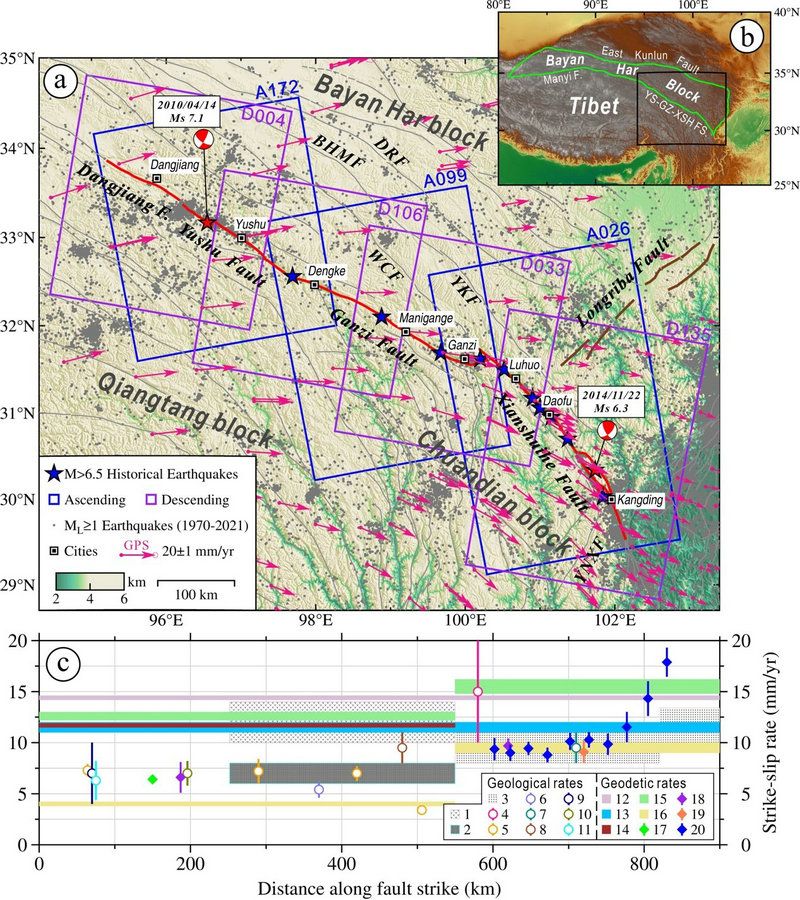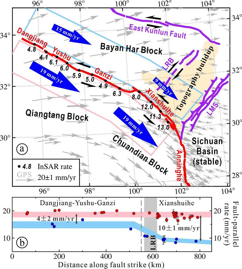 开云下注(中国)官网网讯(通讯员乔鑫、周宇)长约900公里的玉树-甘孜-鲜水河断裂带(图1)是全球地震活动最频繁的断裂带之一,自1700年以来发生了至少12次7级以上的大地震。尽管前人对该断裂带的历史地震破裂与滑动速率等开展了大量研究,但基于有限的野外考察点并不足以定量评价该断裂带的应变积累率和地震潜能。玉树-甘孜-鲜水河断裂带作为巴颜喀拉块体的南边界,其运动学特征对于理解青藏高原东部的构造变形模式也具有至关重要的意义。前人研究表明,该断裂带西部的玉树-甘孜断层与东部的鲜水河断层在地震活动性、滑动速率等方面均存在明显差异,但其成因尚不清楚。