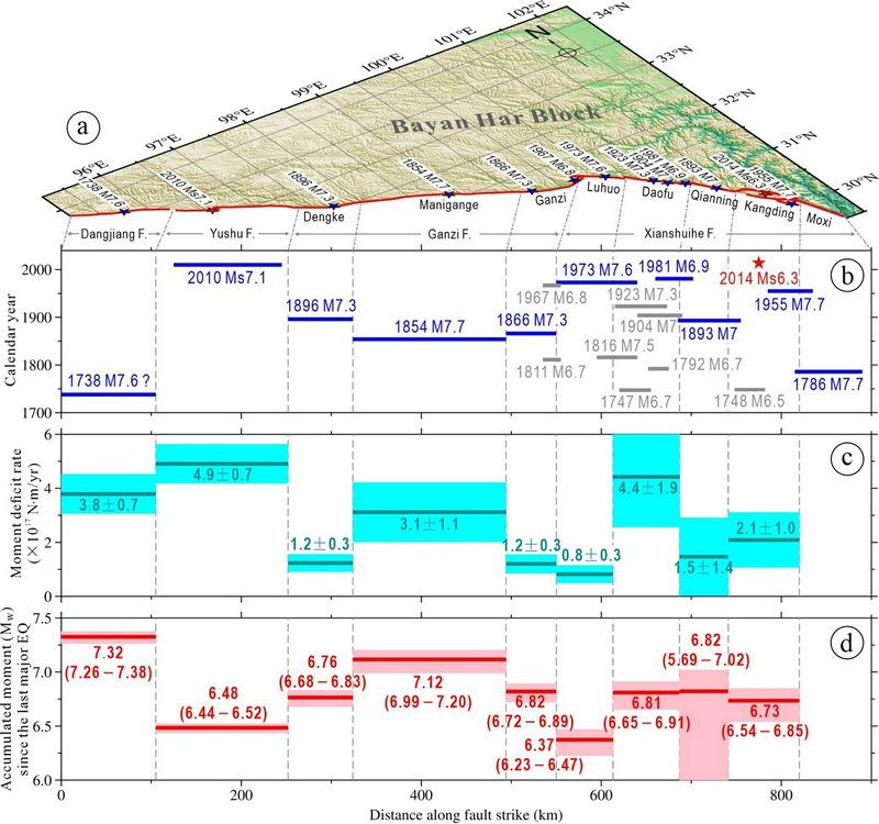 研究结果表明,玉树-甘孜断层的左旋走滑速率约为5-6 mm/yr,远低于鲜水河断层的12 mm/yr的滑动速率(图3)。二者滑动速率的差异可能与巴颜喀拉块体内部不统一的变形模式相关:以龙日坝断层为界,西侧变形比东侧表现得更为刚性(图3)。玉树-甘孜断层与鲜水河断层地震活动的差异可能与它们的构造成熟度有关(图4):玉树-甘孜断层较鲜水河更为成熟,断层面凹凸体更为整合,所以更倾向于产生7级以上的大地震,如2010年玉树地震;相反,鲜水河断层除了7级以上地震外,也会存在许多6-7级的中小型地震(图5),如2014年康定地震和2022泸定地震。玉树-甘孜-鲜水河断裂带各段应变积累速率均较高,部分段落(如当江断层和甘孜断层的马尼干戈段)累积的地震矩足以产生7级以上的大地震(图5)。由于鲜水河断层更容易发生中小型地震,其地震危险性也应引起重视。