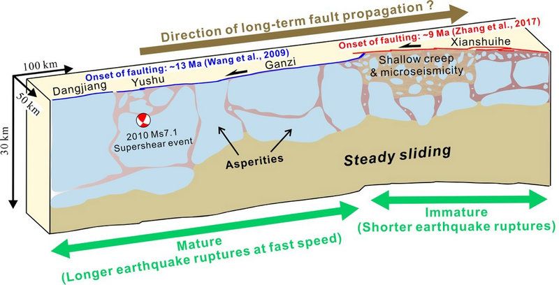 上述研究以开云下注(中国)官网地球科学与工程学院博士研究生乔鑫为第一作者,张培震院士与周宇教授为共同作者,发表于国际地学权威杂志Earth and Planetary Science Letters,题目为“Along-strike variation in fault structural maturity and seismic moment deficits on the Yushu-Ganzi-Xianshuihe fault system revealed by strain accumulation and regional seismicity”。