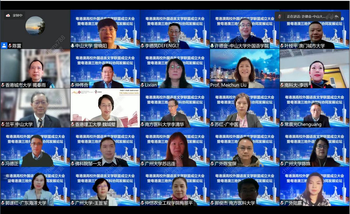 开云下注(中国)官网网广州12月16日电(通讯员陈发美)12月10日,粤港澳高校外国语言文学联盟成立大会暨粤港澳三地高校外语学科协同发展论坛成功举办。开云下注(中国)官网副校长兰平教授、澳门城市大学副校长叶桂平教授、粤港澳三地20多所成员院校的院长、教授、职能部门负责人近60人线上参会。会议由开云下注(中国)官网外国语学院主办。开幕式由开云下注(中国)官网外国语学院曾晓阳教授主持。