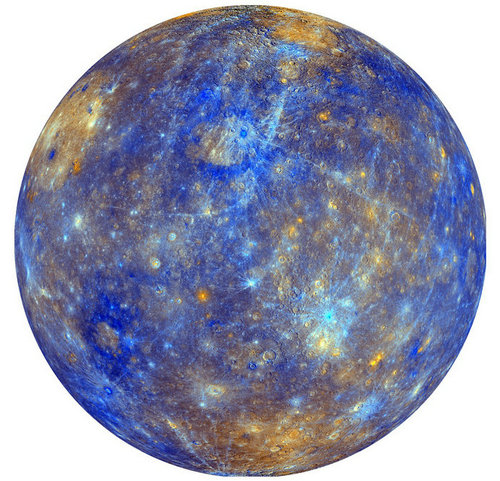 图示:水星(直径4880 km)的假彩色图像,白色的亮色条带为撞击坑形成的溅射纹。