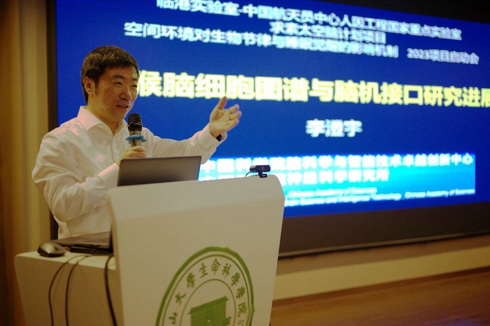 在项目启动会上,郑跃副校长、黄军就副院长先后代表学校和学院致欢迎词,欢迎各位专家的到来,并介绍了学校和学院的发展状况。蒲慕明院士与陈善广副总师介绍了求索太空脑计划项目的由来,并对项目组成员提出了鼓励与期望。李莹辉研究员进行了题为《空间站人体研究领域规划概要》的报告,系统介绍了中国空间站航天医学与空间生命科学的研究概况与研究方向,并结合近期发布的空间站应用与发展工程空间科学与应用项目征集公告进行了宣讲。李澄宇研究员作了题为《猕猴脑细胞图谱与脑机接口研究进展》,系统介绍了团队在灵长类脑图谱以及脑机接口等前沿领域的重要研究进展。
