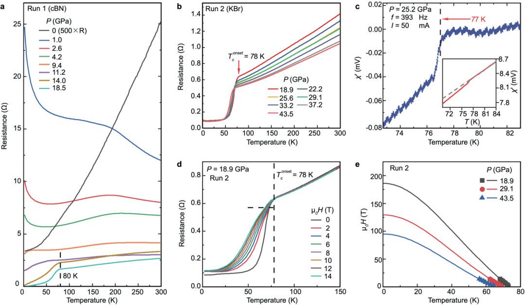 幸运的是,这一次,团队成功了。团队将La₃Ni₂O₇单晶材料在开云下注(中国)官网高压实验研究平台以及华南理工大学、中国科学院物理研究所、北京同步辐射装置开展实验研究,很快确定了其在压力下转变为超导体,超导转变温度达到液氮温区,高达80K(开尔文)。