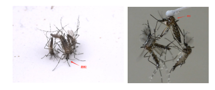 研究团队首先在实验条件下设置不同的雄雌比(埃及伊蚊雄雌比为1:3,49:1和99:1;白纹伊蚊雄雌比为1:3,50:1和100:1)观察雌蚊寿命。研究发现随着雄雌比增加,雌蚊的寿命显著下降。以白纹伊蚊为例,在100:1的比例下,第8天雌蚊的死亡率高达40%,而对照组(1:3)雌蚊死亡率仅为3.8%。视频拍摄记录到了在高雌雄比条件下,雌蚊不断遭受雄蚊的骚扰,特别是当雌雄比达到99:1时,伊蚊雌蚊甚至无法进食(下图左),只能躲在笼子底部以避免雄蚊的骚扰。而雌蚊的任何一次飞行尝试,都会吸引更多雄蚊前来捕获雌蚊以争夺交配权(下图右)。因此,作者认为雌蚊的高死亡率可能是过多雄蚊骚扰限制了雌蚊的觅食,从而导致雌蚊的死亡率增加。