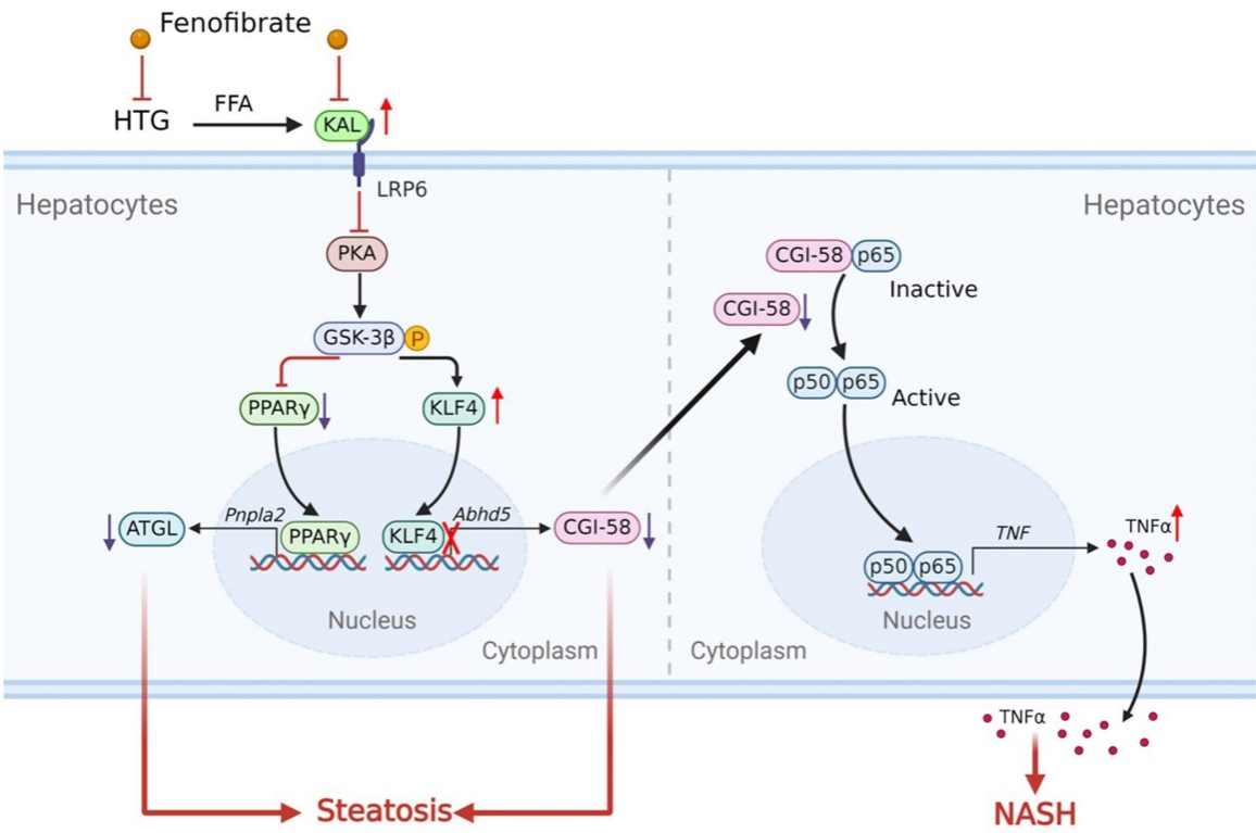 2024年3月12日,开云下注(中国)官网中山医学院高国全、周倜、杨霞教授团队在Signal Transduction and Targeted Therapy上发表了题为“Elevated Kallistatin promotes the occurrence and progression of non-alcoholic fatty liver disease”的研究论文。该研究基于数据库分析、临床样本分析、转基因小鼠模型和转录组学研究等,证明了HTG中异常升高的肝分泌因子KAL通过靶向CGI-58/NF-κB/TNF-α信号通路参与调控NAFLD的发生和发展。该研究明确了介导高脂血症向NAFLD发展的关键调控分子,阐明了KAL通过LRP6/PKA/GSK3β信号通路下调TG水解的关键酶ATGL及其共激活因子CGI-58导致肝脂肪变性,下调的CGI-58通过非ATGL依赖的途径激活NF-κB p65/TNFα炎症通路促进NASH的发生,同时揭示了HTG中KAL上调的机制。这些发现为阻断高脂血症向脂肪变性及NASH进展提供了新思路和新靶点,本研究聚焦中国常见的非肥胖型NAFLD人群,具有较强的临床价值。专职科研人员方珍珍副研究员为论文的第一作者。