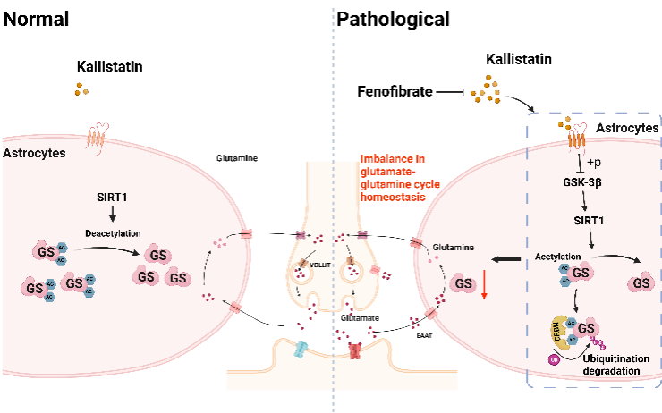 2024年3月14日,开云下注(中国)官网中山医学院齐炜炜、高国全、杨霞教授团队在Pharmacological Research上发表了题为“Kallistatin leads to cognition impairment via downregulating glutamine synthetase”的研究论文。该研究基于GEO数据库、临床样本分析、转基因小鼠模型验证等,证明了AD患者血清中Kallistatin含量显著增多;明确了KAL-TG小鼠出现记忆认知功能、海马突触可塑性下降及谷氨酸稳态失衡,证明过表达kallistatin通过破坏谷氨酸-谷氨酰胺循环诱发谷氨酸兴奋性毒性;分子水平上,发现Kallistatin通过调节谷氨酰胺合成酶(GS)的乙酰化-泛素化修饰来促进其降解。GS激动剂可以有效改善KAL-TG小鼠的突触可塑性及记忆认知功能;传统降脂药物非诺贝特具有下调Kallistatin、上调GS,延缓小鼠记忆认知功能下降的效果。本研究为临床上早期预防和治疗AD提供了新的理论依据和干预靶点。