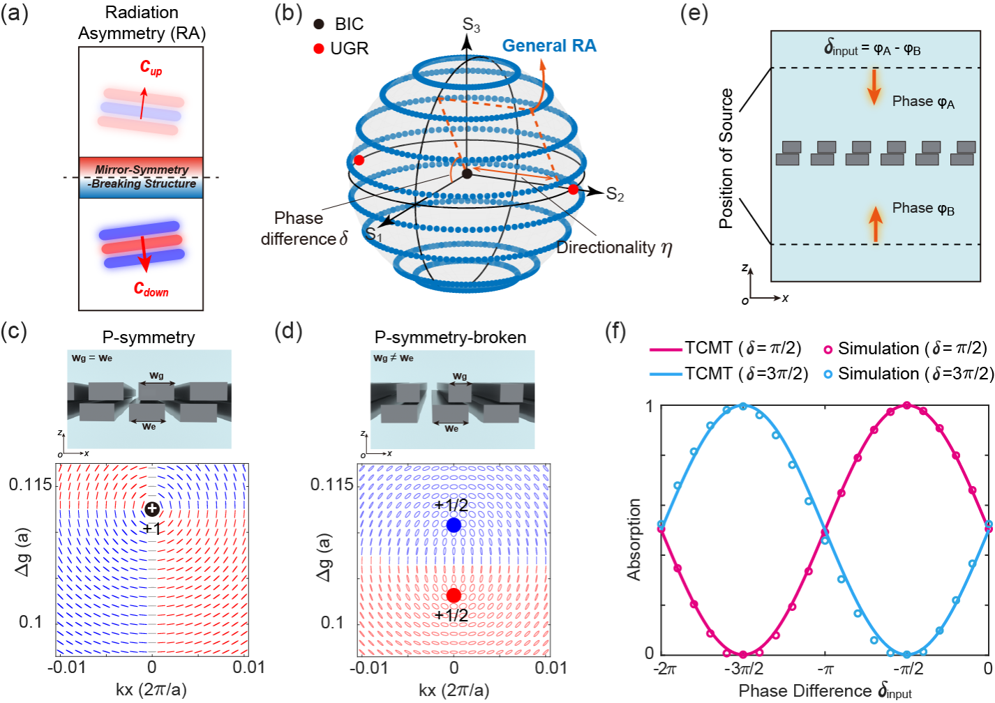 图1. (a) 上下辐射振幅和相位不同的非对称辐射;(b) 任意非对称辐射的庞加莱球表示;(c, d) 打破空间反演对称性前后的赝偏振场分布;(e) 相干吸收示意图;(f) 不同辐射相位差情况下,相干吸收随入射光相位差的变化。