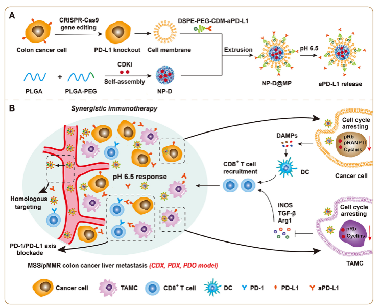 针对结肠癌肝转移瘤的免疫抑制微环境,研究团队利用CRISPR-Cas9技术敲除肿瘤细胞膜表面PD-L1蛋白,提取细胞膜囊泡,并用其制备工程细胞细胞膜修饰的仿生纳米药物,共同递送细胞周期蛋白依赖性激酶1/2/5/9抑制剂(CDKi)和PD-L1抗体。该纳米药物通过工程化细胞膜(CCM)介导的肿瘤同源靶向和PD-L1抗体介导的主动靶向实现肝转移瘤的精准递送,靶向肿瘤微环境中的癌细胞及肿瘤相关髓系细胞(TAMC),捕获G2/M细胞周期,诱导癌细胞免疫原性死亡,促进CD8+ T细胞浸润,将“冷”肿瘤转变为“热”肿瘤;同时,抑制TAMC,逆转免疫抑制微环境,增敏MSS/pMMR结肠癌肝转移的ICB治疗效果。该靶向治疗体系在结肠癌肝转移(PDX)模型及人源类器官模型中具有同样的协同免疫治疗效果。