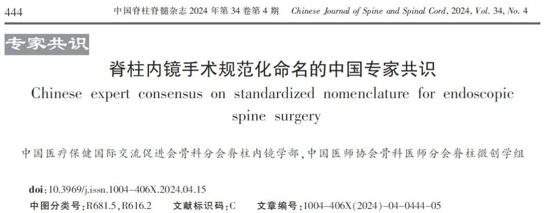 为此,中国医疗保健国际交流促进会骨科分会脊柱内镜学部、中国医师协会骨科医师分会脊柱微创学组在组长戎利民教授的带领下,联合国内30余位知名脊柱微创专家,经讨论总结后形成《脊柱内镜手术规范化命名的中国专家共识》,并发表于2024年第4期《中国脊柱脊髓杂志》。共识的发表旨在使该项技术的命名更规范,以促进业界互相交流及更好地理解内镜技术。