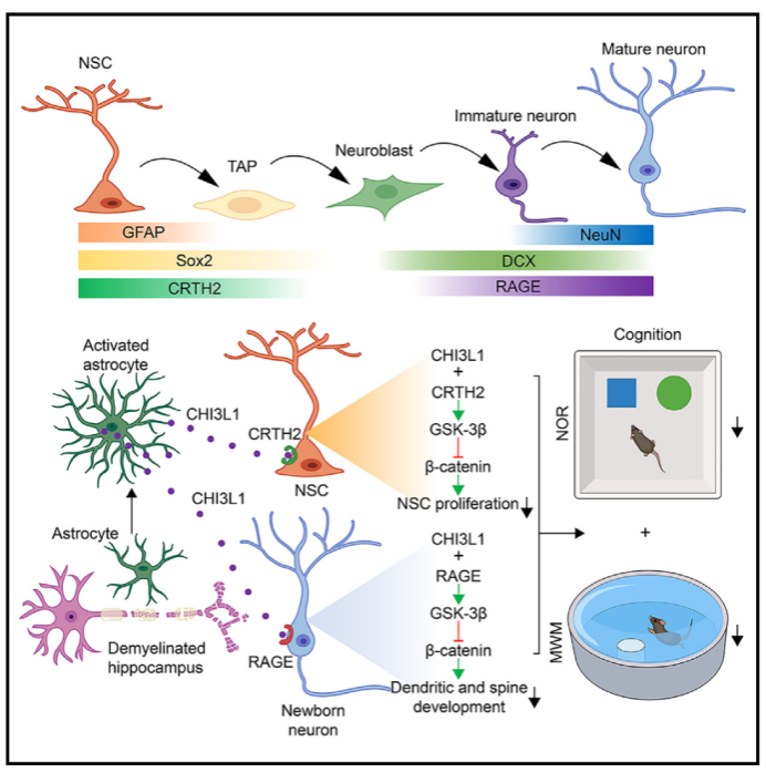 该研究证明来源于星形胶质细胞中的CHI3L1是MS患者和小鼠模型中成体神经发生缺陷及认知功能障碍的关键分子。通过CHI3L1-CRTH2/RAGE-GSK3β/β-catenin信号通路调控脱髓鞘海马的神经发生,可能作为改善神经系统自身免疫炎性疾病认知功能障碍的潜在策略。