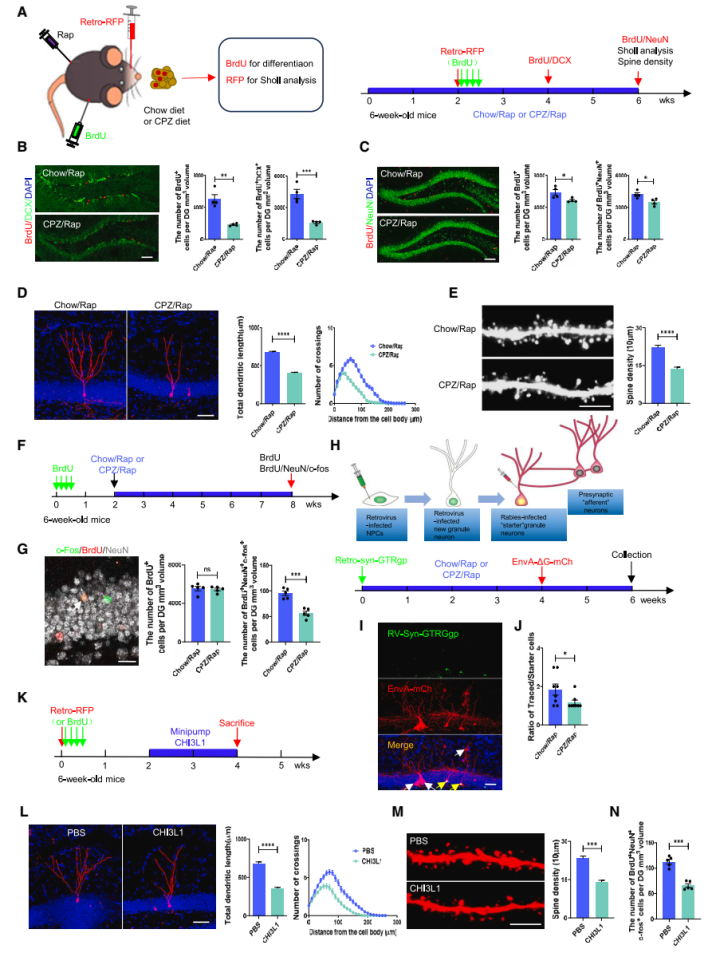 图2 CPZ/Rap给药或CHI3L1过表达对海马新生神经元发育和功能连接的影响