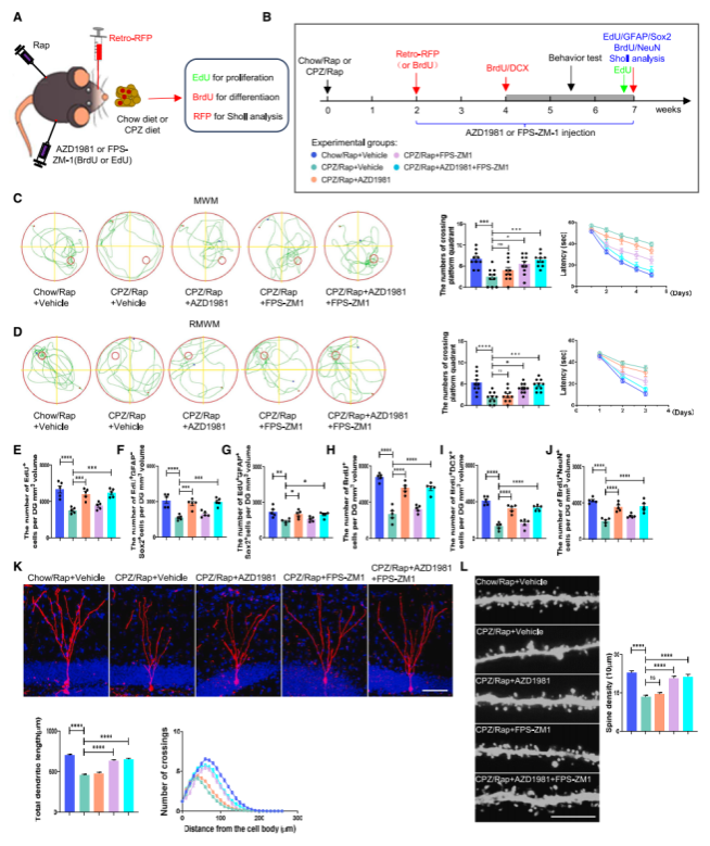 图5 阻断RAGE或/和CRTH2受体对CPZ/Rap小鼠的海马神经发生、新生神经元的发育和认知功能的影响