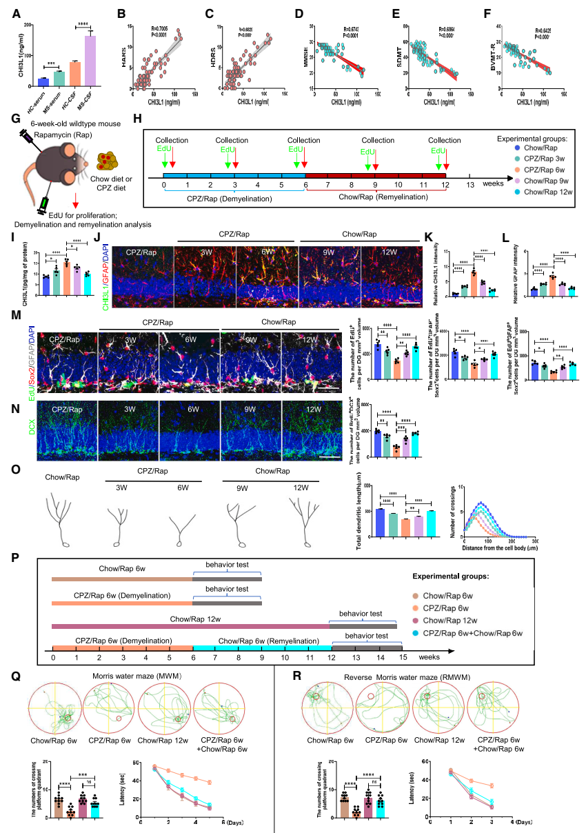 在脱髓鞘和再髓鞘海马中,CHI3L1水平、海马神经发生和认知功能呈动态改变。团队发现,相较于健康对照者, MS患者血清和脑脊液中CHI3L1水平明显升高,血清中CHI3L1含量与认知功能评分呈负相关。另外,在双环己酮草酰二腙/蕾帕霉素(CPZ/Rap)诱导的脱髓鞘海马中,激活的星形胶质细胞内CHI3L1的表达逐渐上调,神经干细胞(neural stem cells, NSCs)的数量逐渐减少,神经元的树突长度和复杂度逐渐下降,学习行为受到明显抑制,而这些改变在再髓鞘过程中得以逆转(图1)。