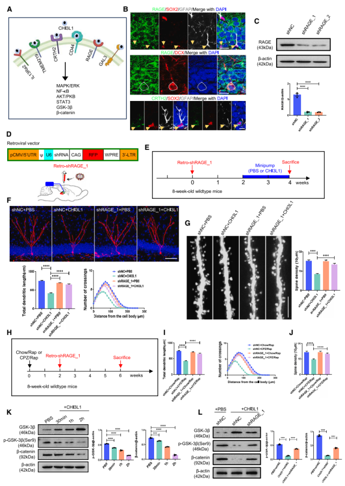 CHI3L1与RAGE受体结合,通过减少β-Catenin信号传导抑制海马神经元发育。研究发现敲降RAGE能挽救CHI3L1过表达和CPZ/Rap干预条件下的新生神经元发育异常。此外,调控CHI3L1/RAGE/β-catenin信号通路可以改善MS小鼠模型中新生神经元的发育缺陷(图4)。
