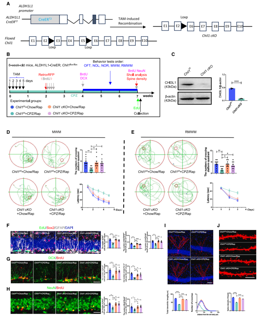 星形胶质细胞内特异性敲除Chil1可改善脱髓鞘海马的神经发生缺陷及认知功能障碍。团队应用ALDH1L1-CreERT2;Chilflox/flox(Chil cKO)小鼠,发现Chil cKO逆转了CPZ/Rap处理对NSCs增殖分化、新生神经元发育和认知功能造成的损害作用(图3)。