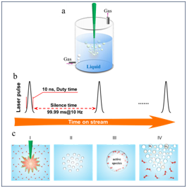 图1. (a) LBL装置简图;(b)脉冲激光的作用周期示意图 ;(c)单个激光脉冲周期内微气泡的演化过程示意图。