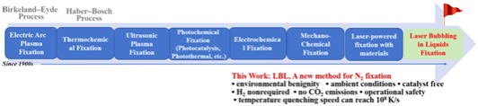 最近,开云下注(中国)官网杨国伟教授研究组提出了一种新颖的激光制造清洁能源技术即液相激光发泡(laser bubbling in liquids, LBL),为能源清洁转化领域带来了新的希望。LBL是以脉冲激光在液相中诱导形成微气泡作为微反应器来进行化学反应。泡泡内的峰值温度可高达上万 K,同时微气泡能够实现快速升温和降温,速率可达108 K/s。这显然是一个远离热力学平衡的状态,为化学反应提供了一个极端的环境。许多在常态下需要借助催化剂才能进行的化学反应,在小泡泡里面很容易就能发生。这种方法不仅不涉及任何催化化学过程(无需催化剂和复杂的催化反应装置),而且在常态下进行,简单、清洁、高效(图1)。很显然,对于在催化化学以外的常态条件下,去探索简单、绿色、高效的清洁能源制造技术来说,LBL方法打开了一扇大门,同时,也开辟出一条超越催化化学反应的道路。目前,杨国伟教授研究组与柯卓锋教授团队合作将LBL技术应用于清洁能源制造,取得了一系列重要的研究进展。