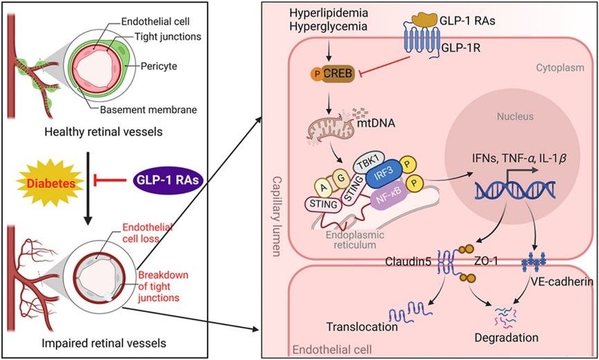 开云下注(中国)官网网讯(通讯员何学敏、文思颖、唐喜香)糖尿病视网膜病变(DR)是糖尿病的重要微血管并发症,也是首要致盲性眼病,全球发病率高达22.27%。目前的治疗手段主要针对DR中晚期,临床上尚无有效的药物用于长期预防和早期治疗。胰高血糖素样肽-1受体激动剂(GLP-1 RAs)是近年来治疗糖尿病的“明星”药物,但对于DR患者应用GLP-1 RAs这类药物尚存在很大争议。