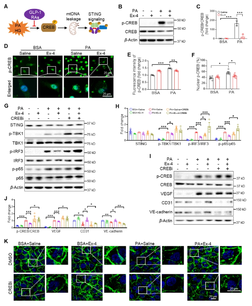 图3. GLP-1 RA通过 CREB抑制糖尿病视网膜血管的STING通路激活