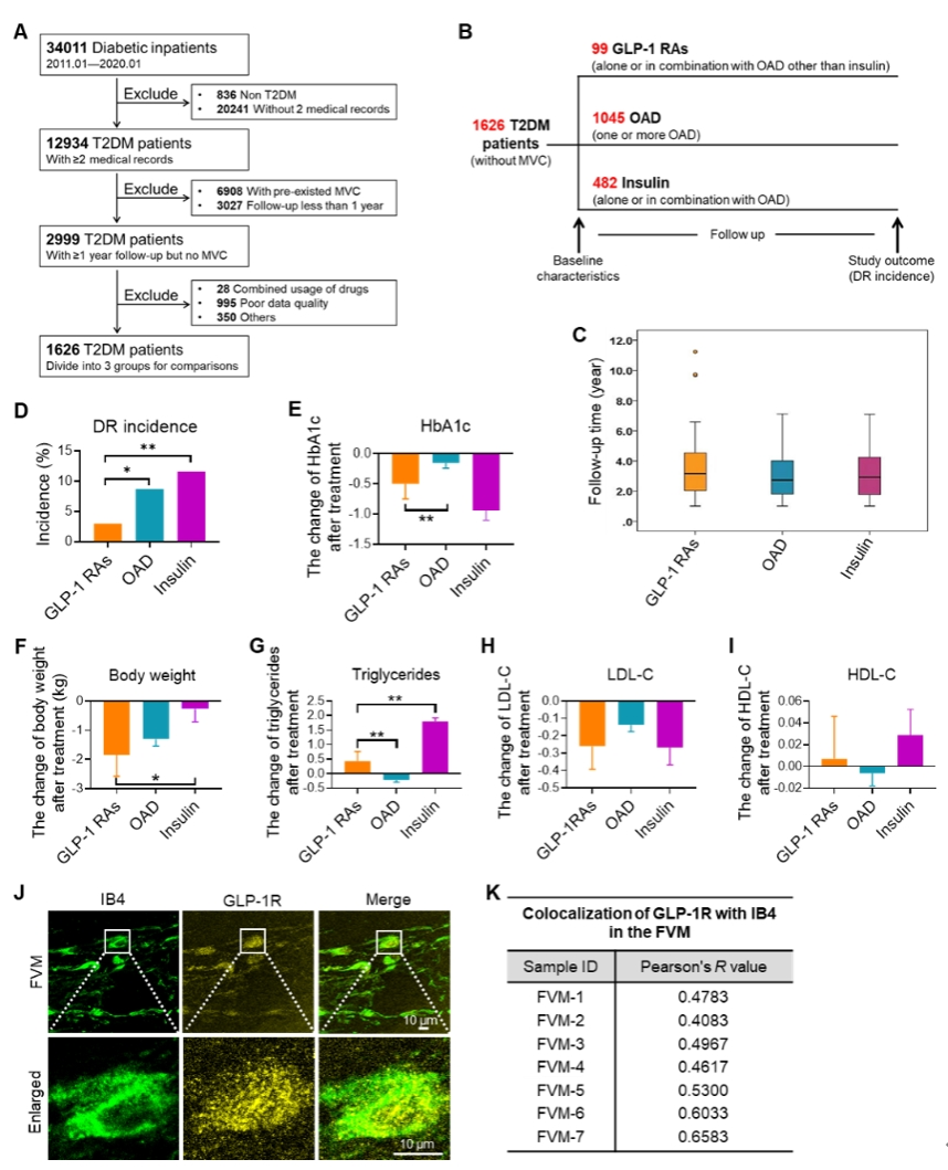 通过对2011年至2020年在附属第三医院住院的34011例2型糖尿病患者进行回顾性分析发现,相较于使用其他口服降糖药或联合使用胰岛素,使用GLP-1 RAs能显著降低DR发生率,为DR早期防治提供新的临床证据。