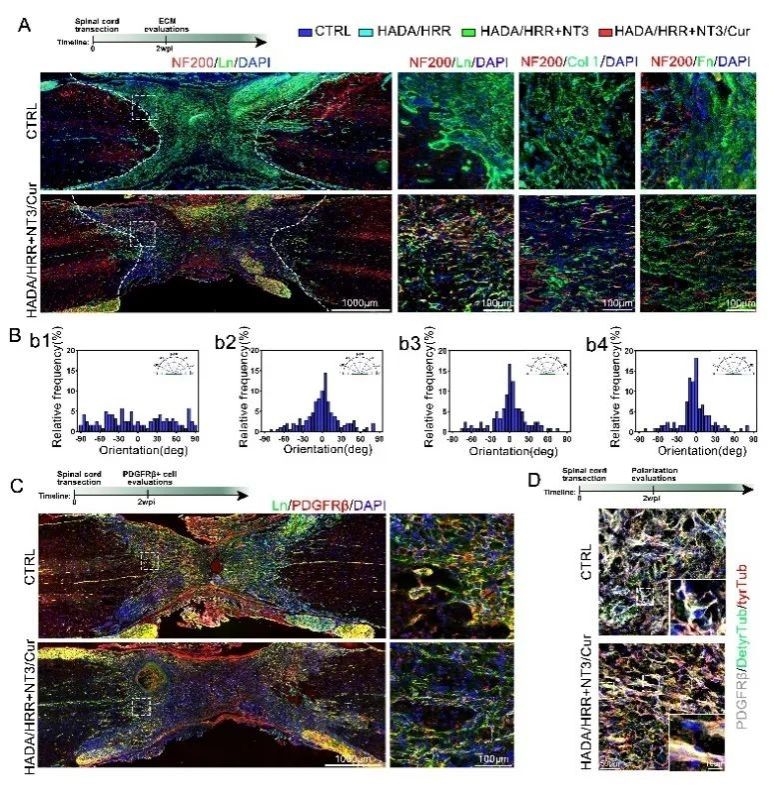 在正常组织中,细胞外基质(extracellular matrix,ECM)为细胞的生存及活动提供适宜的场所,但脊髓损伤后ECM过度沉积形成纤维瘢痕,成为轴突再生的物理屏障。该团队发现,HADA/HRR水凝胶逆转了脊髓损伤后纤维化过程,获得平行排列的结构引导再生轴突生长,而非无规分布的致密瘢痕。进一步研究发现,PDGFRβ+细胞(脊髓损伤后纤维瘢痕主要形成细胞)在HADA/HRR水凝胶干预组呈平行排序方式向水凝胶迁移,而非无干预组的无规迁移。缓释NT3和Cur后能够进一步增强ECM重塑效果(图2)。这提示,HADA/HRR水凝胶通过调控PDGFRβ+细胞行为重塑ECM,为脊髓损伤后纤维瘢痕干预提供了一种创新策略。