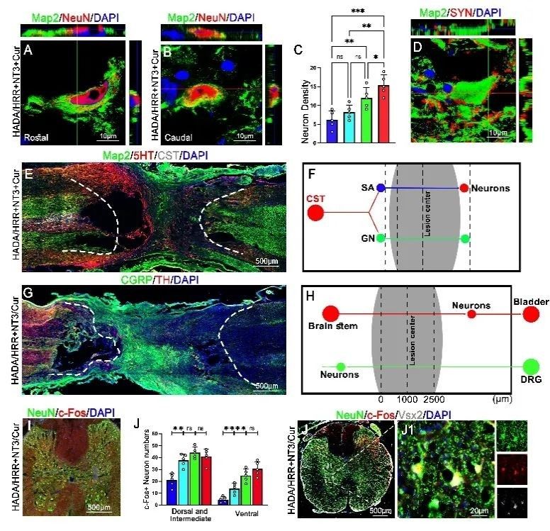 在该研究中,HADA/HRR+NT3/Cur水凝胶促进了损伤边界中间神经元的存活。这些激活的中间神经元作为中继站,与中断的上下行神经纤维形成了异质性突触结构,实现神经联系的“精准”重建,促进了运动、感觉和膀胱功能恢复。