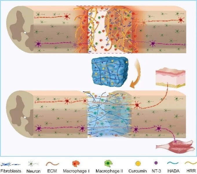 图1:HADA/HRR+NT3/Cur水凝胶重塑细胞外基质重建上下行神经联系
