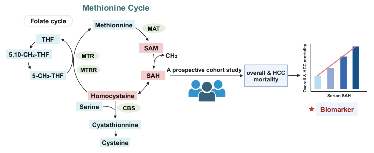 这项大型前瞻性队列研究首次证明血清SAH可作为一种新型的肝癌预后生物标志物,并间接强调了蛋氨酸代谢紊乱在肝癌进展中的重要作用。