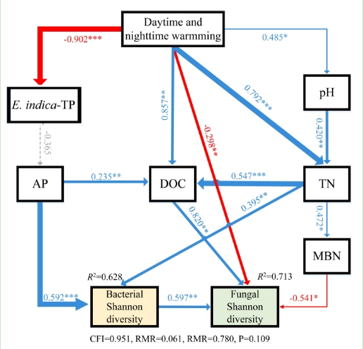 图1.白天和夜间增温下土壤温度对土壤细菌和真菌香农多样性的直接和间接影响的结构方程模型(SEM)