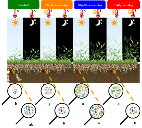 图2.白天和夜间变暖对土壤微生物群落多样性影响的概念框架