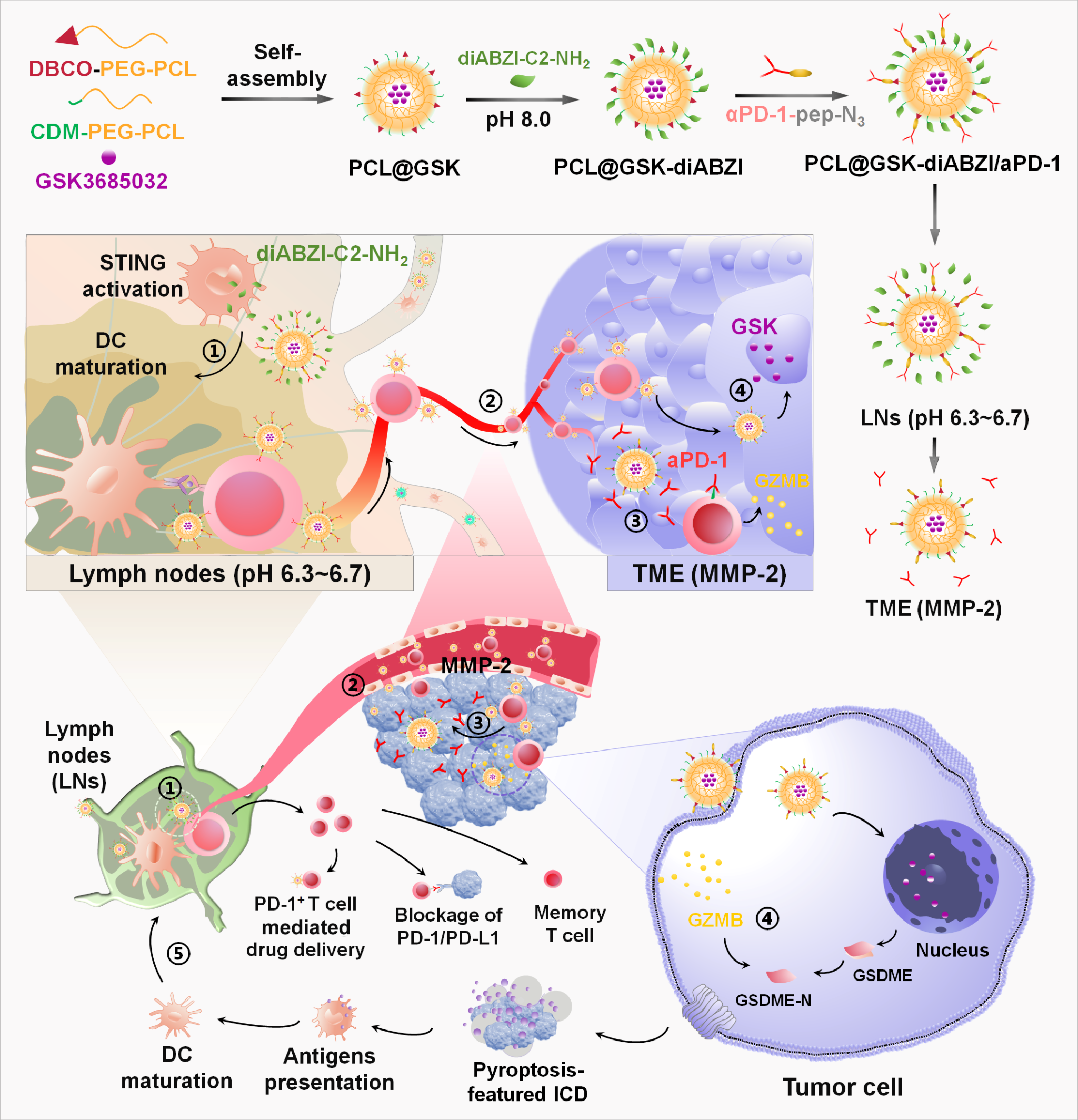 为此,任杰教授团队与帅心涛教授团队提出了一种策略来增强癌症-免疫循环(图1),该策略包含淋巴结中的免疫激活、T细胞介导的药物递送、以焦亡为特征的ICD和ICB治疗等程序,并构建了一种pH和酶双重响应的纳米药物,能在淋巴结和肿瘤组织中顺序释放药物,以实现程序化的抗肿瘤免疫激活。这种纳米药物首先能在淋巴结酸性环境中(pH 6.3~6.7)释放STING激动剂diABZI-C2-NH2来激活DCs和T细胞。随后,携带PD-1抗体(aPD-1)的纳米药物与活化的T细胞(PD-1+ T细胞)结合,利用这些细胞的肿瘤归巢能力实现高效的肿瘤靶向药物递送。在肿瘤组织中,基质金属蛋白酶-2(MMP-2)切割酶敏感肽(pep)以释放纳米药物,同时将aPD-1留在T细胞上进行ICB治疗。此外,纳米药物还可递送DNA甲基化抑制剂GSK-3484862(GSK)到肿瘤细胞中,以抑制其增殖并上调GSDME,诱导肿瘤细胞焦亡产生ICD。通过精心设计的淋巴靶向策略和响应性机制,成功激活了完整的癌症-免疫循环,从而带来了显著的抗肿瘤治疗效果。