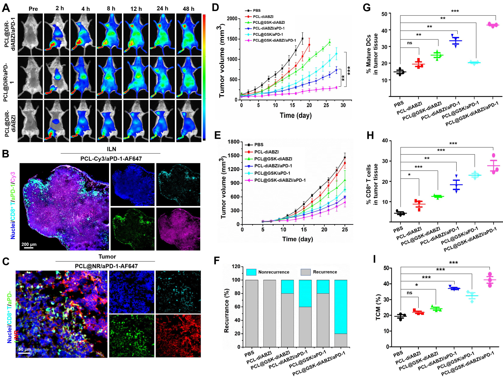 图2 (A)纳米药物的肿瘤聚集效应。ILN:腹股沟淋巴结。(B)LNs中pH响应性药物释放和(C)肿瘤组织中MMP-2酶响应性aPD-1释放。(D)接受不同纳米药物治疗的小鼠平均肿瘤生长曲线。(E)不同纳米药物治疗小鼠肿瘤复发的统计分析和(F)继发性肿瘤生长曲线。流式细胞检测显示了小鼠肿瘤组织中(G)成熟DC细胞、(H)CD8+ T细胞和(I)血液中央记忆T细胞(TCM)的占比。