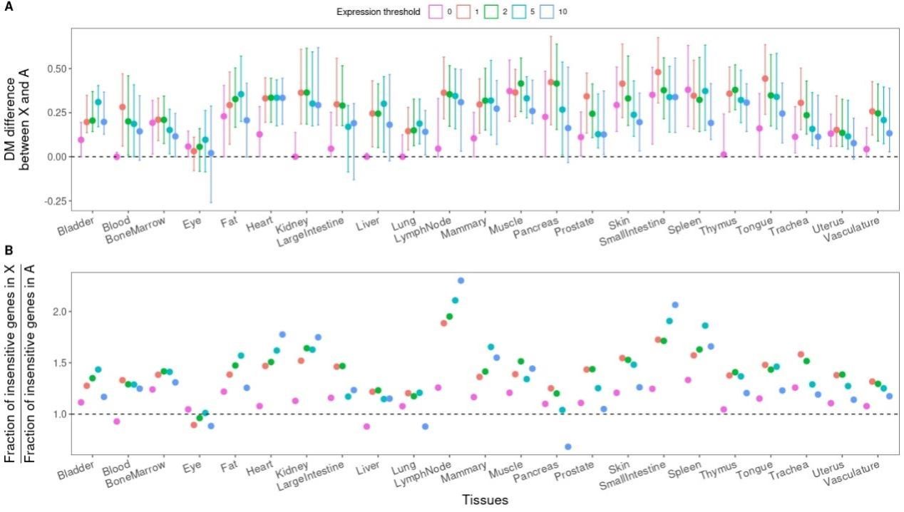 研究人员首先使用模拟scRNA-seq和bulk RNA-seq数据集评估了两种常见的X:AA基因选择策略,即按基因表达水平过滤和按基因表达比例过滤。他们发现这两种策略都会产生夸大的X:AA表达比率,从而人为地支持剂量补偿模型。