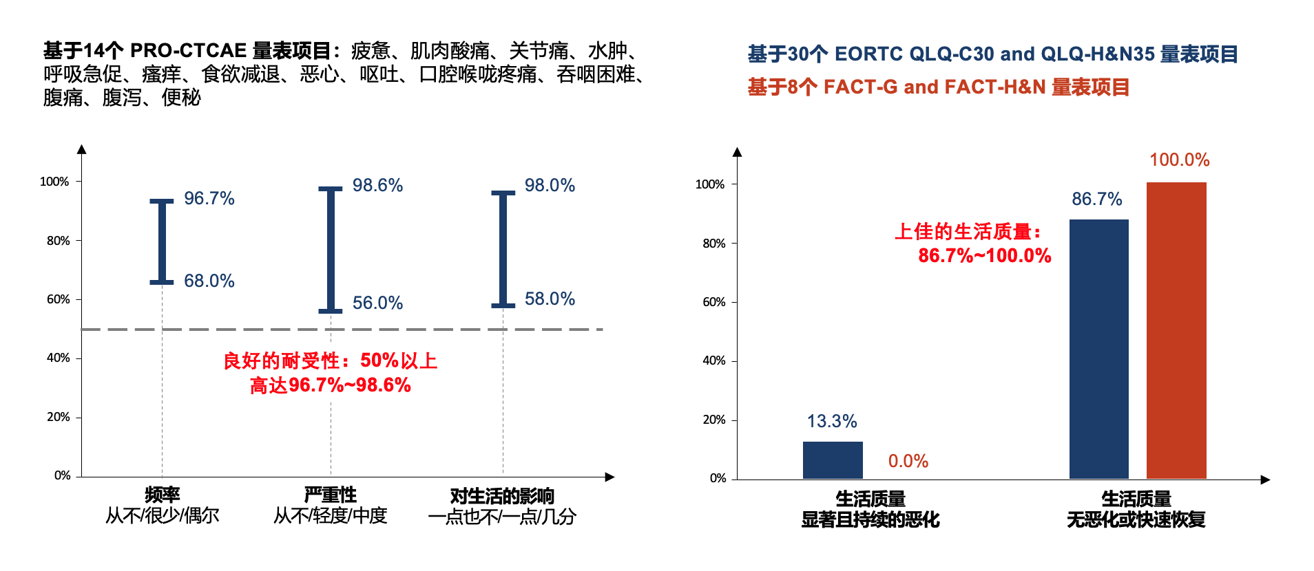 此外,患者对该疗法所致14个毒性事件的频率、严重性、对生活的影响方面显示出良好的耐受性(50%以上,高达96.7%~98.6%)。基于欧洲癌症治疗组织问卷的30个项目,以及美国癌症治疗功能评估问卷的8个项目,患者接受该疗法后具有上佳的生活质量(86.7%~100.0%),由此首创了局晚期鼻咽癌“高效低毒、耐受优质”的免疫治疗联合放化疗的治疗新策略。
