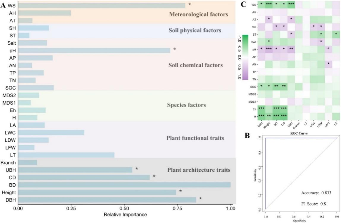图1各类变量对CDF和NCDF分类模型的相对重要性(A),分类模型的精度评价信息(B)以及植物性状与其它因素的热度图(C)。