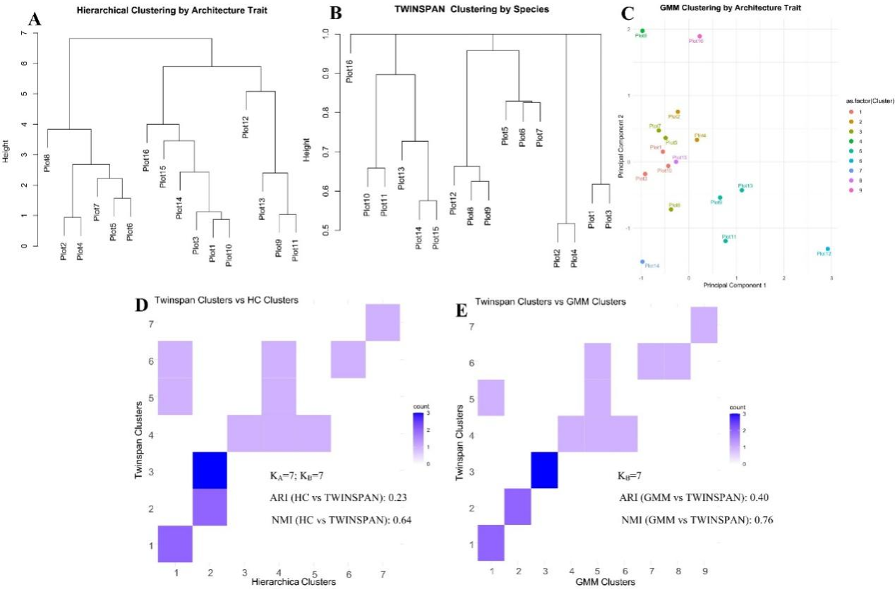 图2 针对CDF的群丛,基于植物构型性状的Hierarchical Clustering(A)、传统的基于物种的TWINSPAN Clustering(B)和基于植物构型性状的GMM Clustering(C);三种聚类结果的交叉表以及一致性评价(D和E)。
