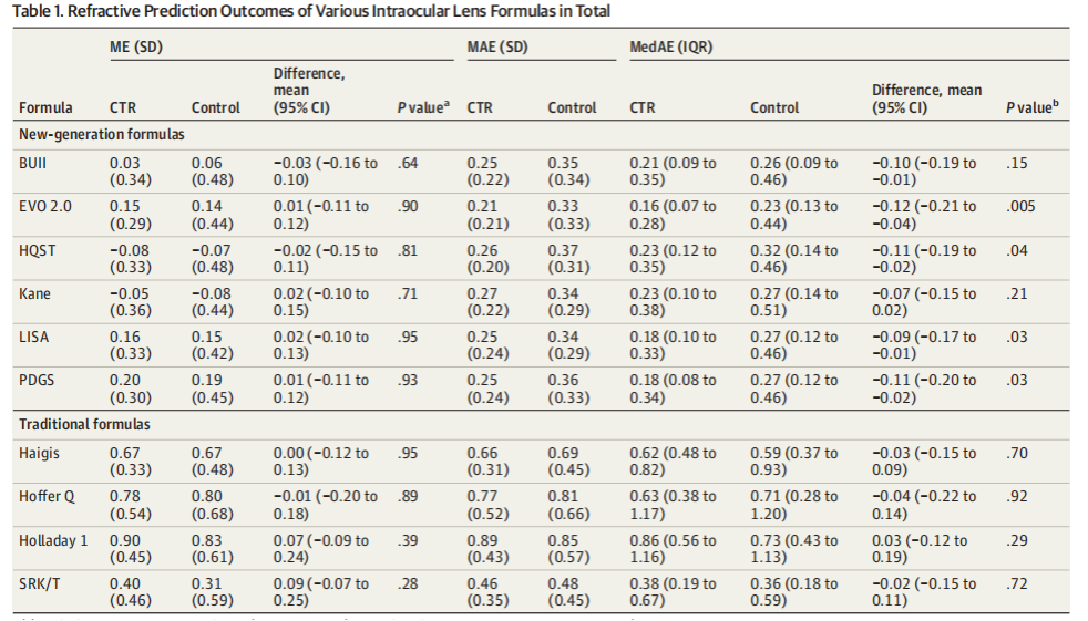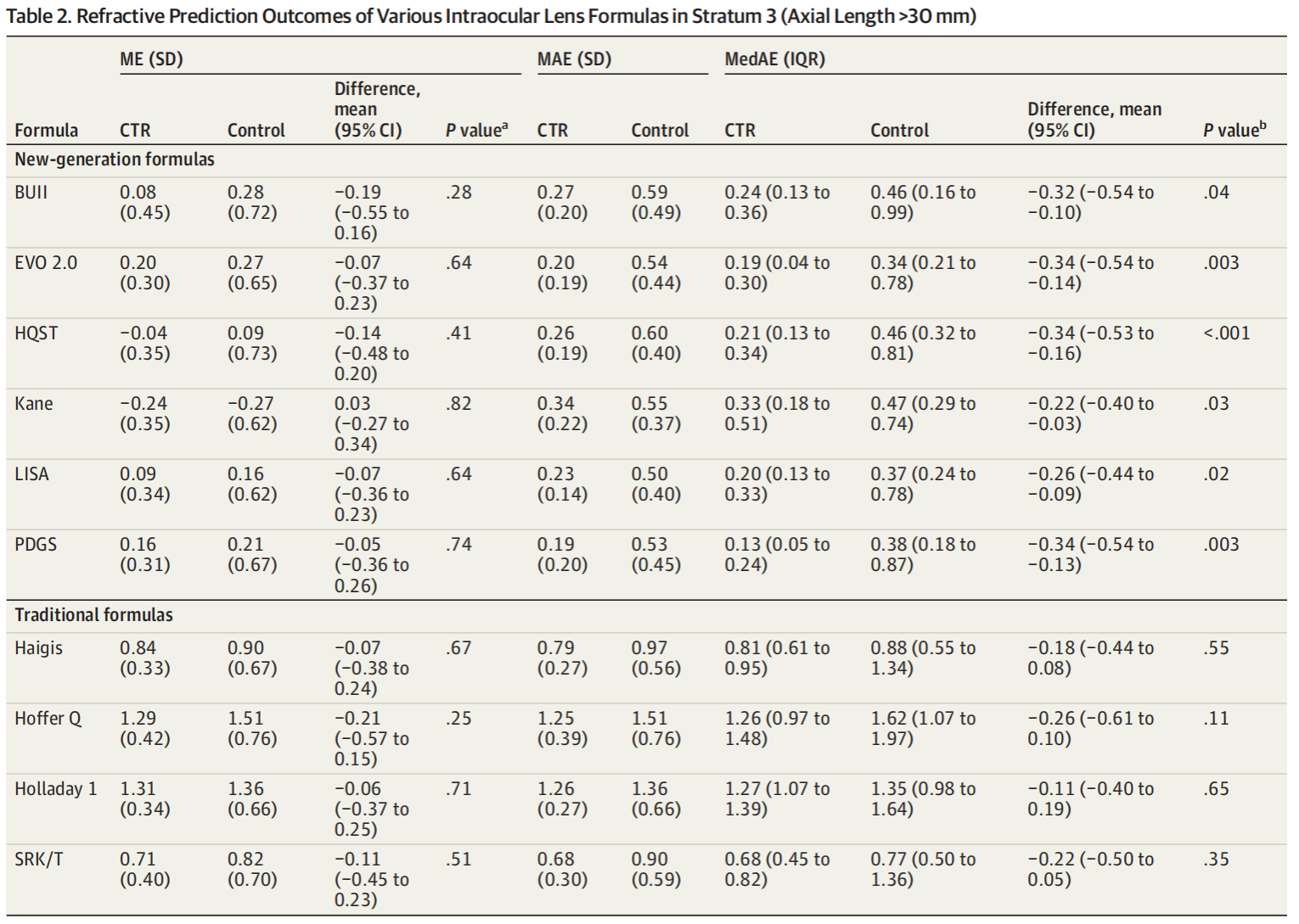 近日,罗莉霞教授团队在JAMA Ophthalmology上发表RCT研究的二次分析成果。研究采用按AL分层随机对照的设计,将患者分为26mm≤AL<28mm、28mm≤AL<30mm以及AL≥30mm三层,每层随机分配至对照组(不植入CTR)或试验组(植入CTR),并在二次分析中进一步排除了最佳矫正视力<20/40和散光大于3.0D的患者。结果显示,高度近视眼植入CTR不会引起屈光漂移,无需额外调整目标屈光度设计,并显著提升AL≥30mm患者在新一代IOL屈光力计算公式中的预测准确性。