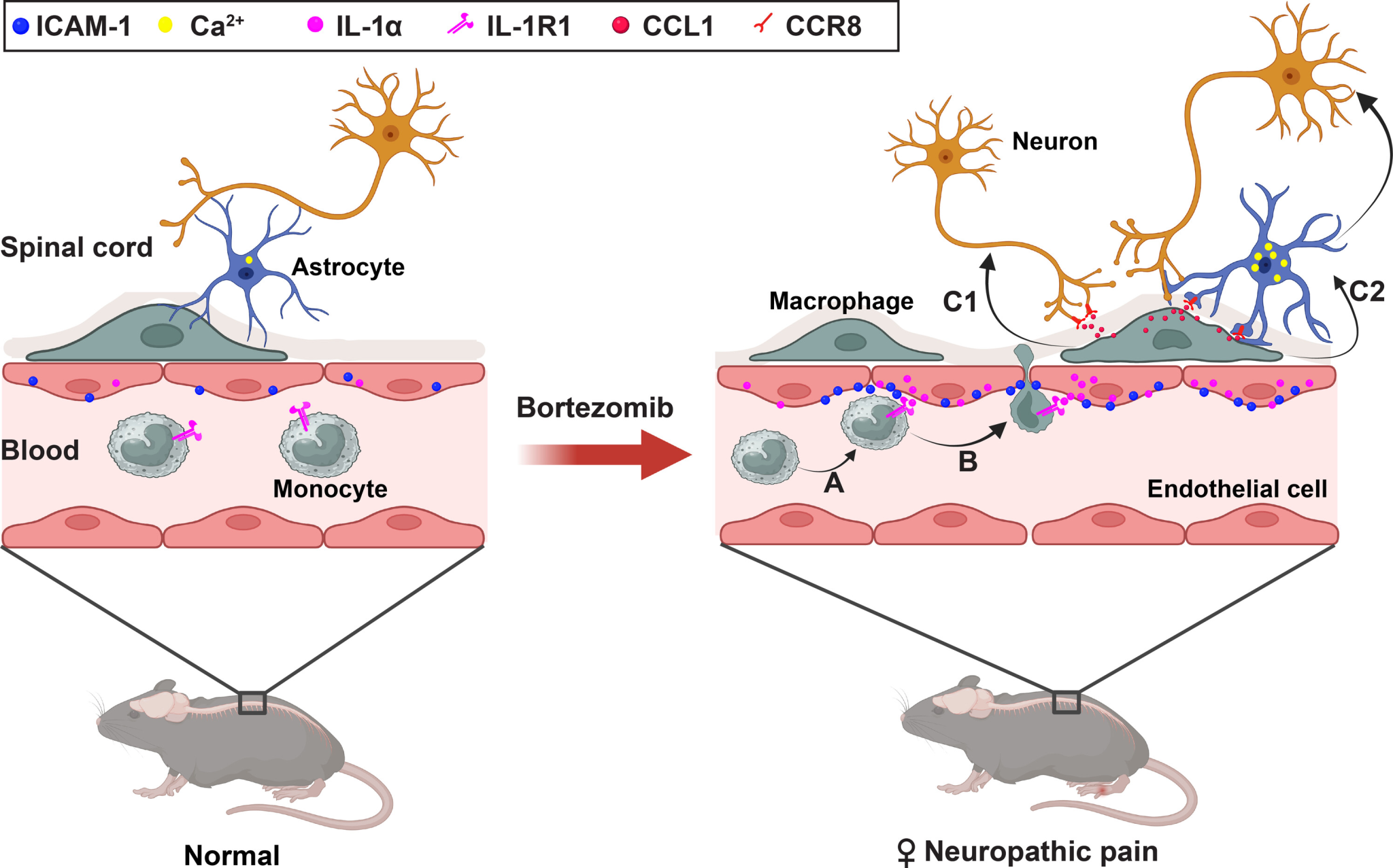 研究团队首先通过临床回顾性分析发现,女性多发性骨髓瘤患者在接受BTZ治疗期间更早出现感觉障碍,且该现象不受年龄、疾病分型、分期所影响,提示存在性别特异性的致痛机制。在C57小鼠模型中,明确了ICAM-1在雌鼠中介导脊髓巨噬细胞浸润,促进CCL1释放并作用于神经元与星形胶质细胞,进而增强脊髓神经元兴奋性并诱导早期机械痛敏。该研究在临床与动物模型中系统性地揭示了硼替佐米诱导的神经病理性疼痛在雌性个体中早期发生的分子机制。