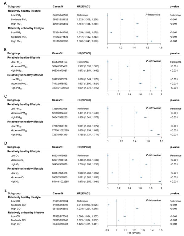 该研究依托超过580万人的超大规模队列数据,系统评估了五种空气污染物(PM₁、PM₂.₅、PM₁₀、O₃、CO)与生活方式对CVD风险的独立及联合影响。研究发现,空气污染和不健康的生活方式均显著增加CVD风险,且在生活方式不健康的人群中,空气污染的危害效应尤为突出。