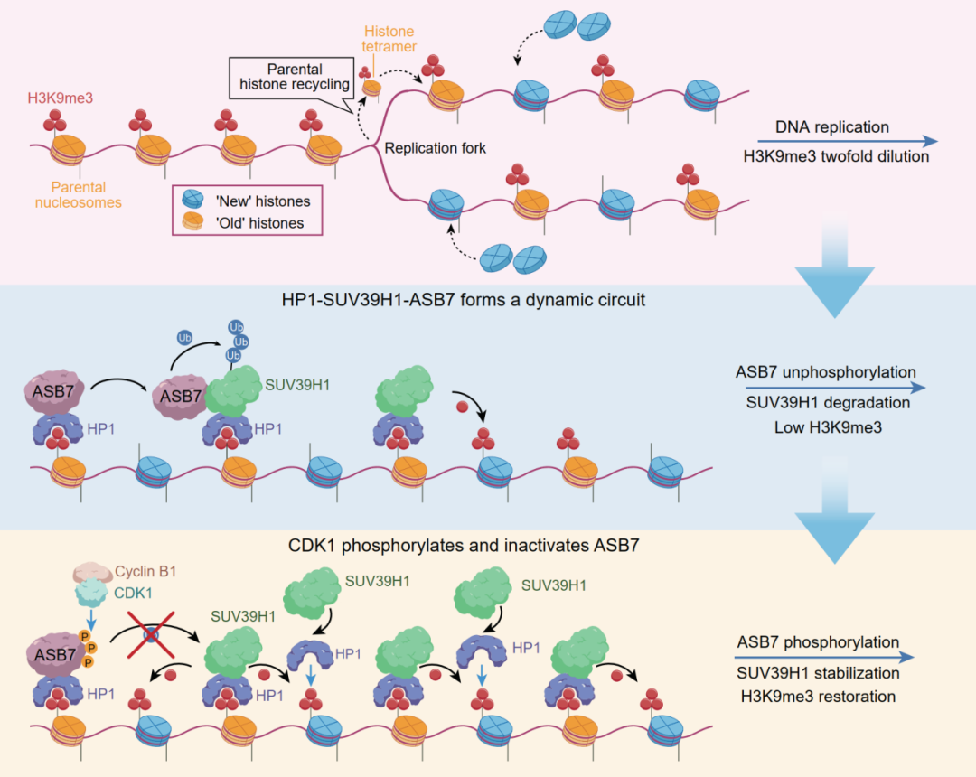 研究团队通过全基因组范围的CRISPR-Cas9遗传学筛选,发现E3泛素连接酶ASB7是H3K9me3的核心负调控因子。在调控机制上,H3K9me3的阅读器HP1可招募ASB7至异染色质区域降解SUV39H1,这一过程受到细胞周期激酶CDK1-Cyclin B1严密控制,进入有丝分裂M期后,CDK1磷酸化ASB7并阻断其对SUV39H1的泛素化降解,保障了H3K9me3在随后细胞周期中的重建。该研究表明,在哺乳动物体细胞(含肿瘤细胞)中,“读-写-降解”平衡,而非经典的“读-写-擦除”平衡,可能是H3K9me3维持表观遗传稳态的基本机制。