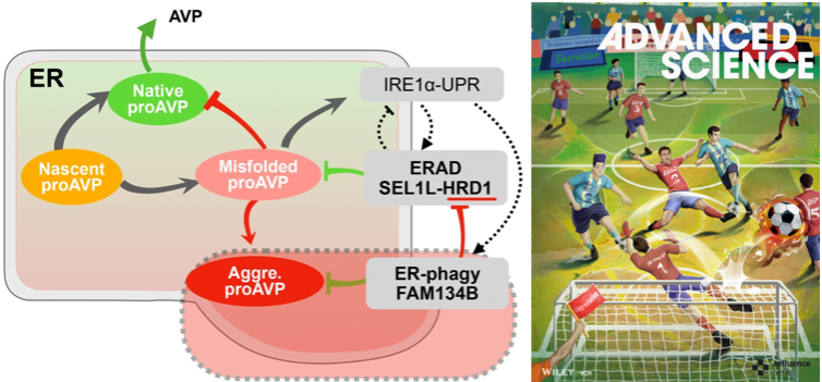 基于该研究的重要发现,被杂志社推选为封面论文。该封面创意设计成一场“分子足球赛”,红队(防守方)代表错误折叠蛋白降解机制、分子伴侣等保护因素,其中ERAD是“后卫”,作为第一道防线,时刻拦截错误折叠蛋白;自噬是“门将”,作为第二道防线,扑救蛋白质聚集体。蓝队(进攻方)代表脱水、衰老等致病因素,促使激素前体错误折叠。足球:象征激素前体,若被红队控制则为健康状态、可正确分泌,若被蓝队掌控则错误折叠、导致疾病。